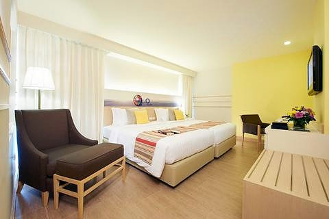 在芭提雅住的pattaya sea view hotel,住的城景房(因为我们后面还要去巴厘岛,所以在泰国就不准备享受酒店及海景啦),2晚614元,就在芭提雅海边的一条巷子里,往前走一分钟就到海边,往后走5分钟左右就可以到蒂芬妮人妖秀,地理位置还是很优越的,酒店环境也很不错,属于A-ONE酒店集团旗下的小清新的商务酒店,打的去的时候一定要和司机说在A-ONE酒店附近,不然不知道的真的很难找,我们当时没说,所以就围着那条巷子一直兜呀兜了将近半小时都没找到,后来还是在A-ONE附近下的车,看路牌(巷子入口有酒店指引牌)找到的。