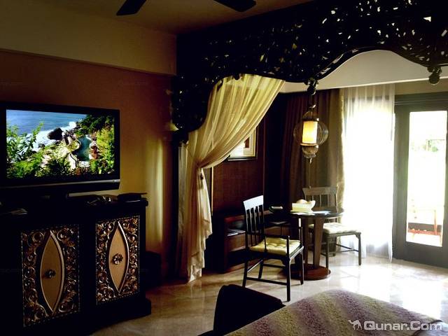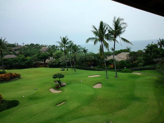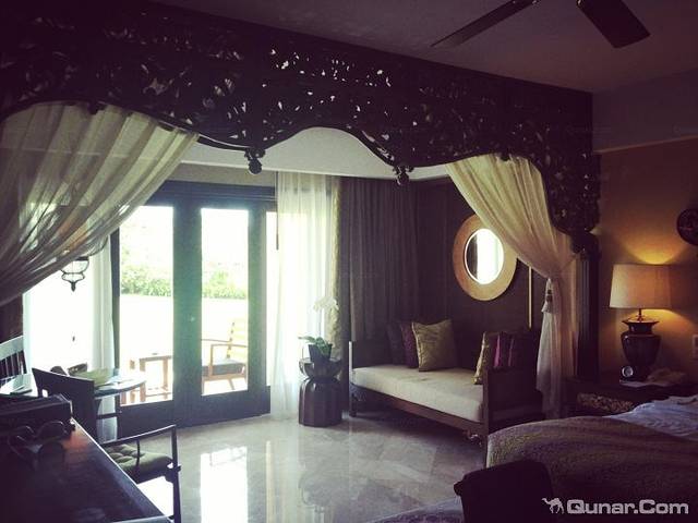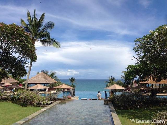 在巴厘岛,第一站我们住的是金巴兰的AYANA,海湾景房2晚3600元。这间酒店想必大家早已听过他的盛名了吧,酒店非常非常非常的大,出入可以坐酒店的穿梭游览车,整个酒店像一个大公园,很好玩,传说中的无边泳池,rock bar真的是名不虚传,住宿环境也非常正点,我们住的是海湾景房,订的时候没看清楚,以为是海景房,去到才发现是海湾景不是纯海景哈,隔着一个高尔夫球场可以看到海,不过视野也是很棒,环境也很好,和澳门的威尼斯人的房间布局及装饰挺相象的,但外部环境完胜,以及有我特别喜爱的阳台,上面有榻榻米,没事坐在那喝喝茶聊聊天吹吹风,太惬意了。