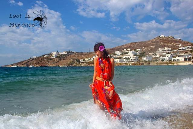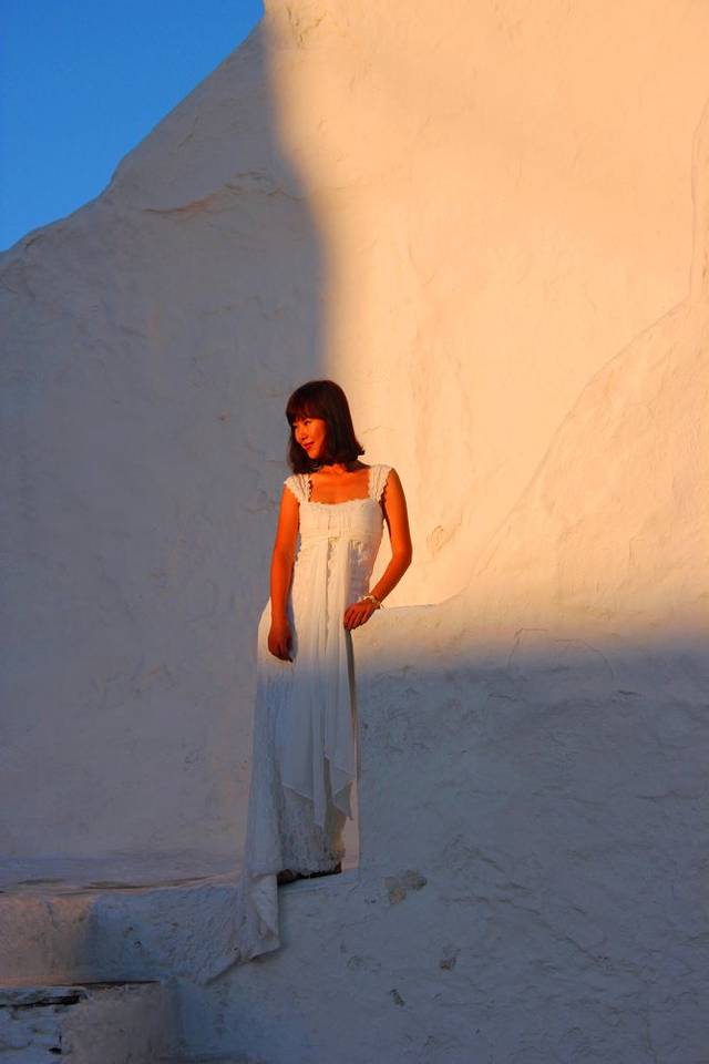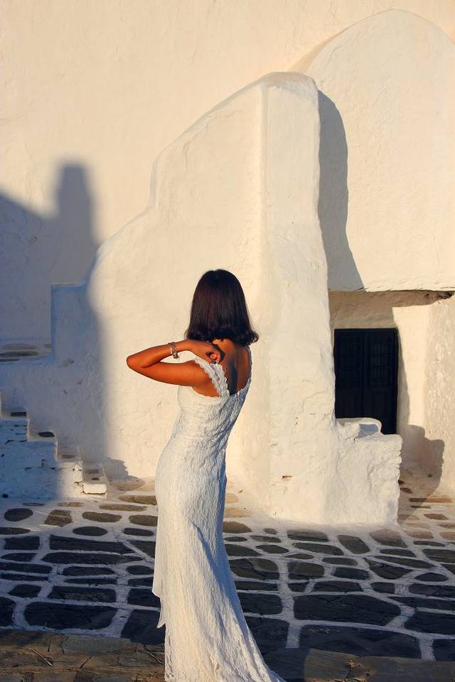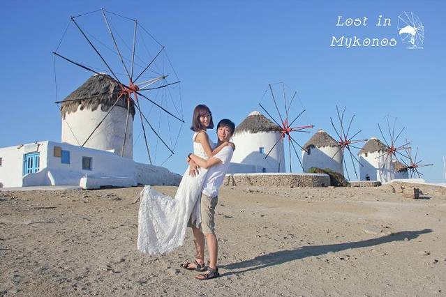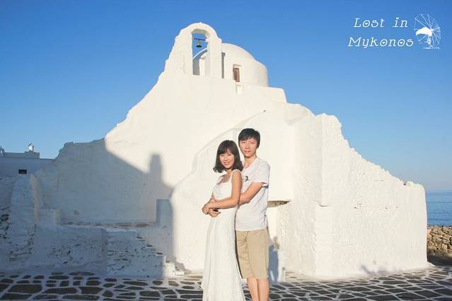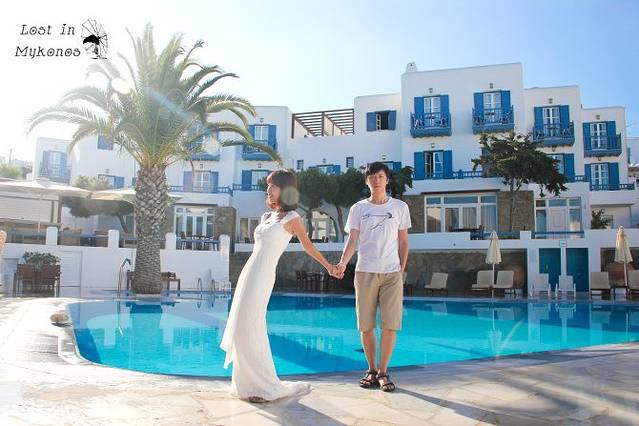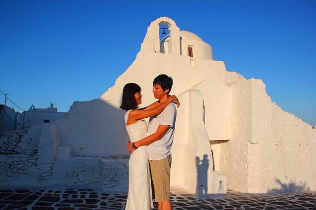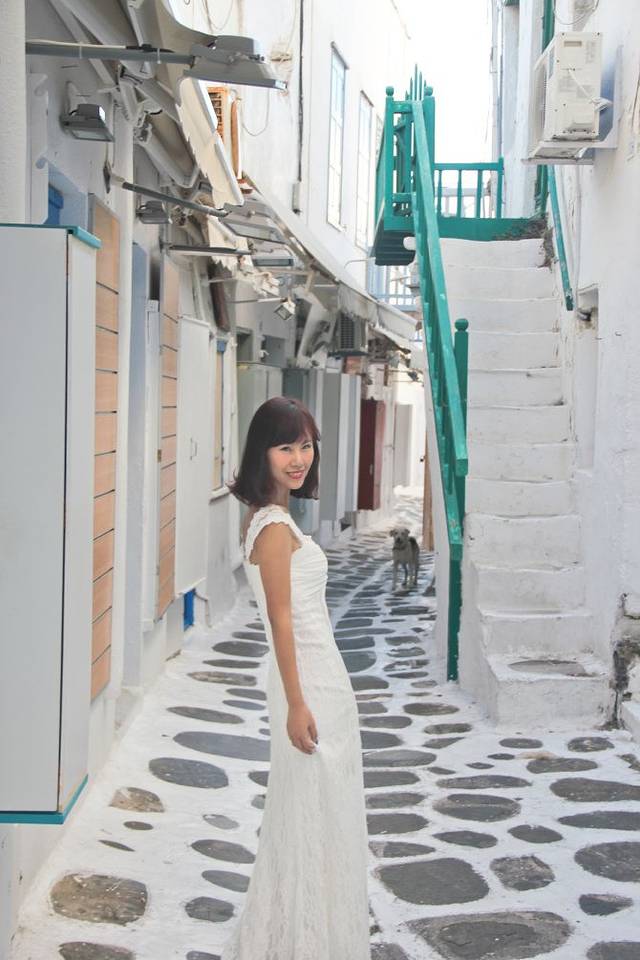 清晨起来,准备开始希腊第一任务:拍婚纱。早上阳光还不烈,镇上和海边也还没有多少游人,趁着好时机,穿上婚纱,带上脚架,出门拍照。