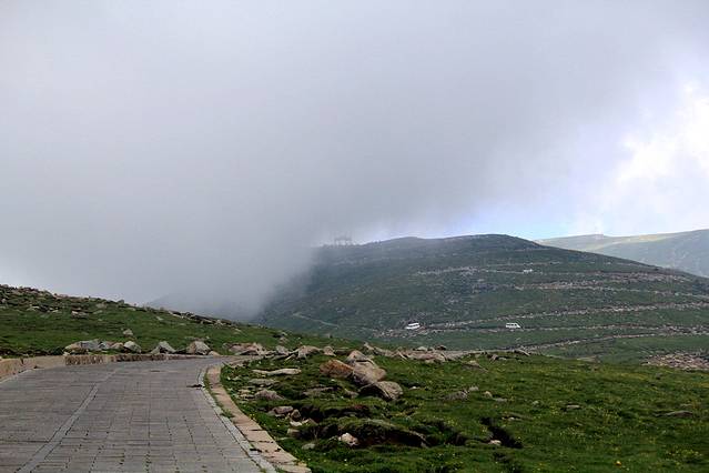 前行的路在一点点被浓雾吞没,北台的台牌一会儿就消失在雾里,一会儿我们就要走左边的山路登上去,远方右侧的盘山路是汽车走的,白色的车是山上的摆渡车,花钱乘坐。
