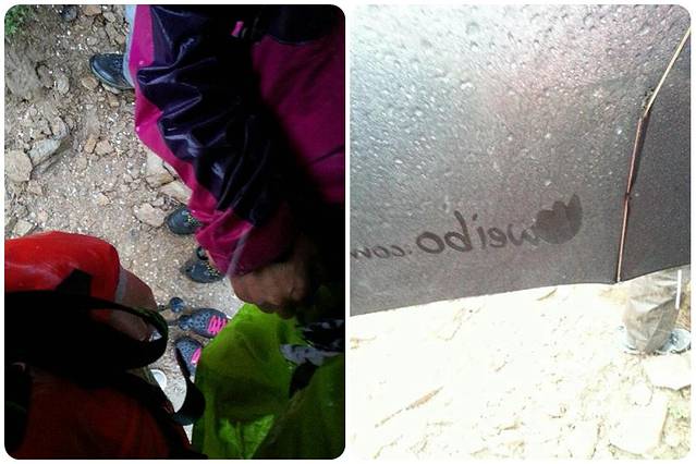 我们的鞋子、裤子都湿透了,好在上身穿了雨衣,背包有防雨套,否则也都湿掉了,没想到冰雹越下越大,大的都有指甲盖那么大了,实在走不了了,我们就举着伞躲在一小坡边上,路上两位大姐也纷纷躲了进来,此时,偷偷往外瞄了几眼,其他的小伙伴也都围在一起等待冰雹过去。突然想到寺庙里工作人员说,前一天晚上两个女的登山被大冰雹砸晕了,让110拉下去了,想想就可怕啊。好在我们躲了一阵儿,冰雹终于停了,雨伞上、地上、背包上都已经是白色的了。