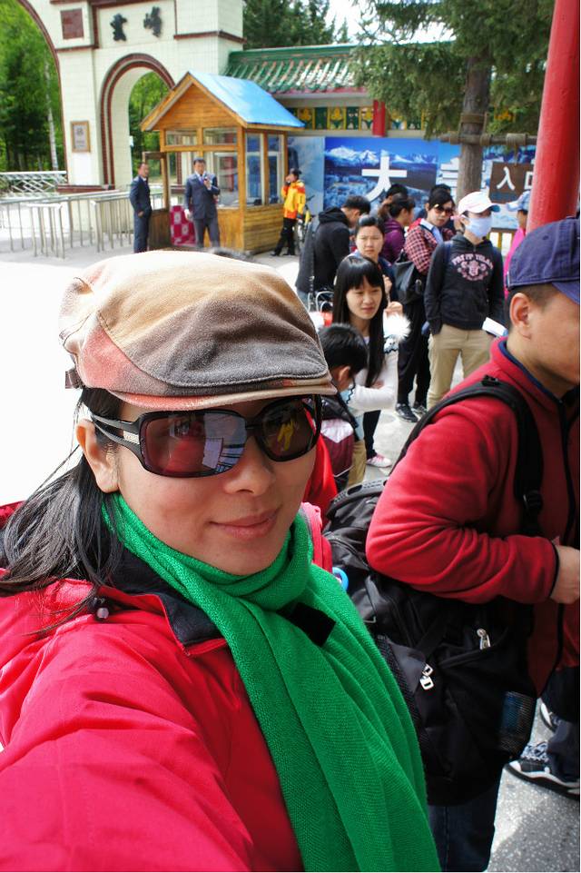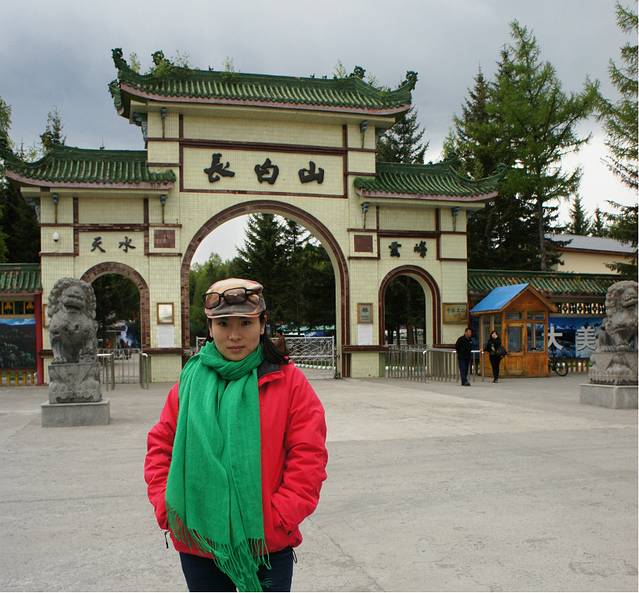 车把我们送到离正门还有几百米的地方,因为再往前就不让进了。正门外有很多店铺,可以租大衣、帽子和手套,开始我还笑为何要租手套,但上到天池我才知道手套是多么的有用。价格不是很贵,衣服好像才50元一件。