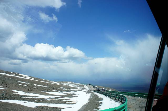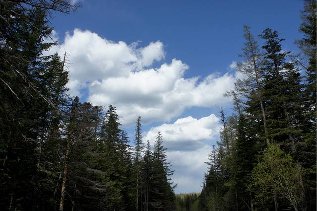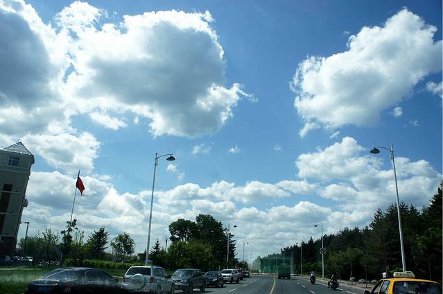 话说人品好真是没办法,那个天气啊,好的不得了,蓝蓝的天,层层的白云,一路上,我不停的惊呼和感叹。通往长白山的路两旁被茂密的树围着,一眼望过去都是翠绿翠绿的,让人心情极舒畅。对面车道偶尔会有黄色的出租车驶过,司机师傅说,现在是淡季,路上的车很少,等到6、7月份就开始人多了,最旺的时候,这条路上都是车,满眼看过去都是黄色的。