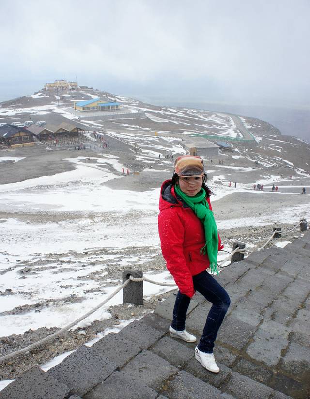 终于到达山顶,下了车就感觉空中飘着细小的雪花,往天池走的路上,风越来越大,雪花也越来越多,刺骨的寒风呼呼的打来,真的很冷啊~好在俺下了火车就穿上了保暖裤~这个时候,手套对于拿相机的人是多么的重要呀,无知无知的我很是后悔没有租~