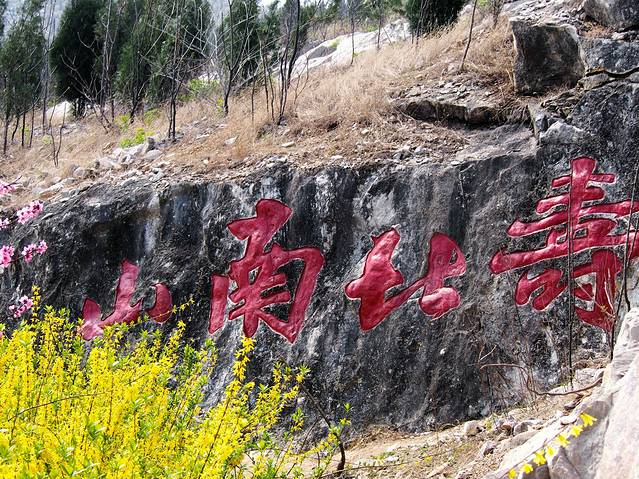 寿比南山的题字,与黄花相映,分外醒目。