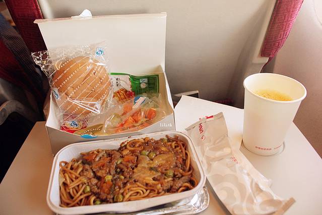 由于是在餐点,我们还吃了顿飞机餐。我吃的面,还蛮喜欢那酱的,面包配黄油我也蛮喜欢。