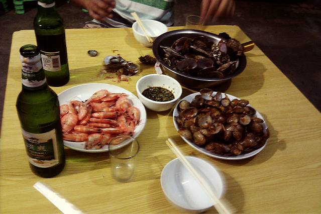 电厂这边有很多选择,有宾馆度假村;私人公寓出租(家庭适合,可以烧饭);和农家院 。我们毫不犹豫的选择了农家院,因为带着狗出来的,老板很淳朴,50/人/天,不包吃,后来商量到100/人/天,包吃。餐标50一天,淳朴的老板狠了心的给我们做着各式小海鲜,呵呵,连我家狗子的饭都包了。