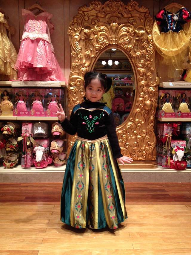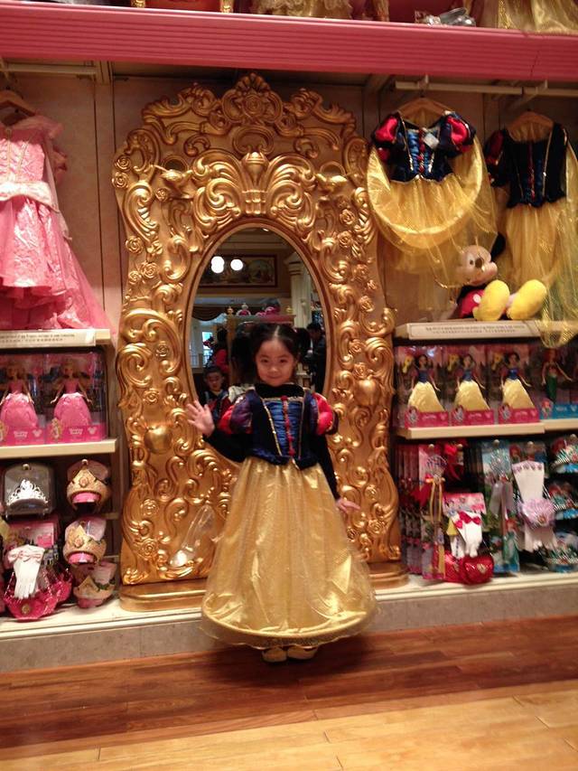 剩下最后一站了。先去迪士尼画室学画画,不过要等一阵儿才开始,于是先去逛街,轩爸为了弥补女儿没有和公主拍照的遗憾,给女儿买了条漂亮的公主裙,彬见了也给自己选了件Mickey和唐老鸭的T恤。