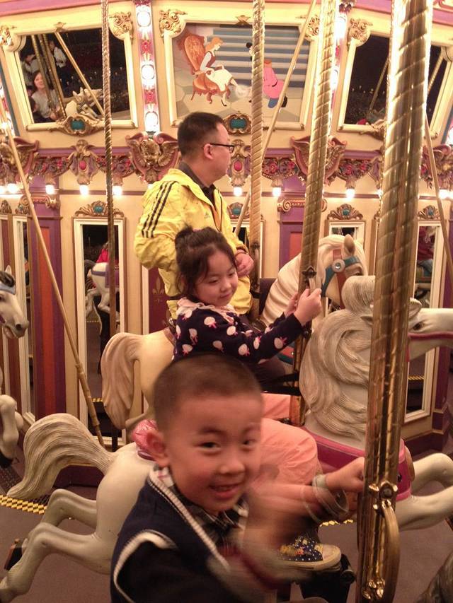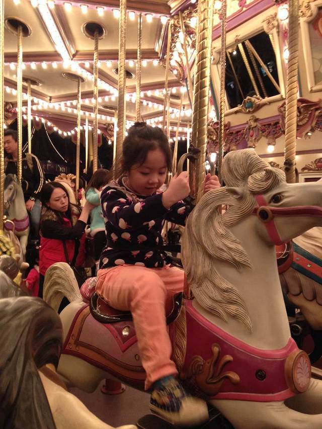 接着又重新排队玩了旋转木马,两头坚持要自己每人骑一匹马,不同我和她爸爸一起。