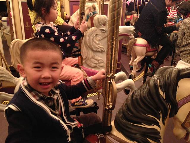 补充了体力后又继续啦!先是排队玩旋转小飞象。之后排队等灰姑娘旋转木马。