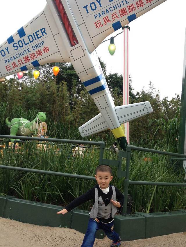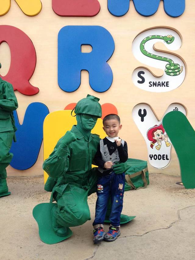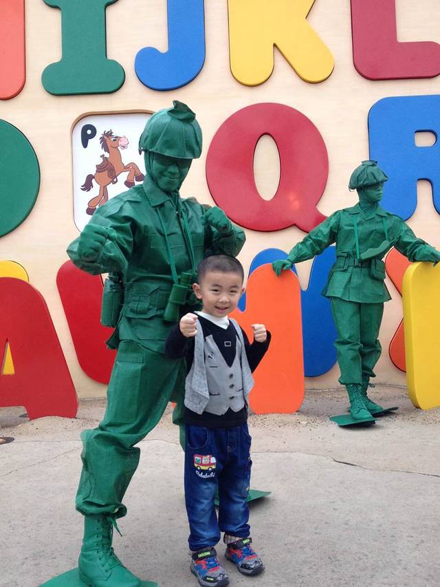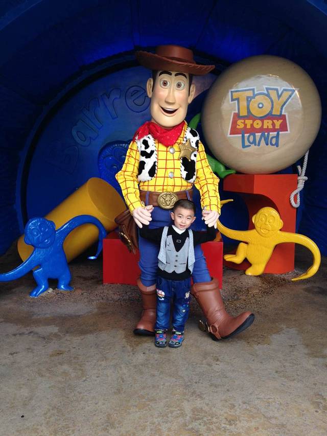 一进门就是和安迪合照的地方,彬要去洗手间,刚好我和轩排队合影。在这里有第一张也是唯一一张一家四口在乐园的合影呢。