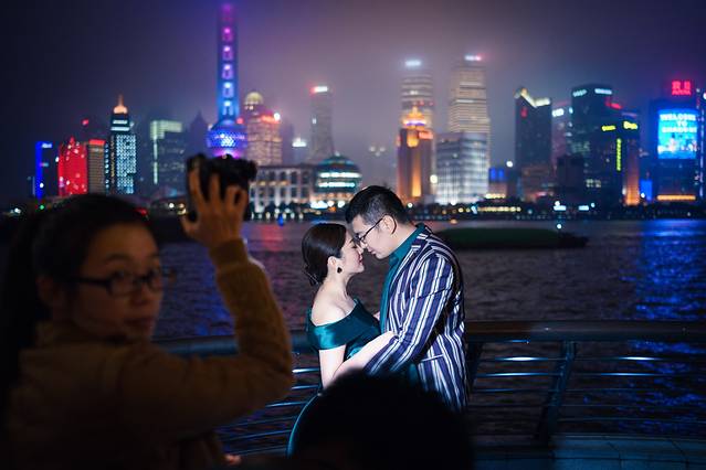 刚好碰到一对新人在拍婚纱,果断上去前蹭拍。举灯的大姐,不好意思哦!