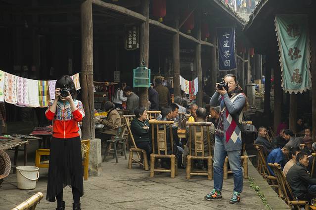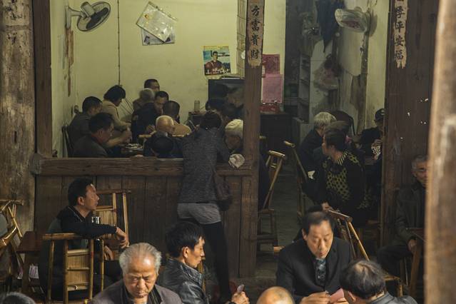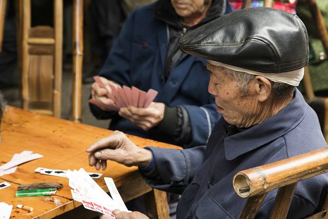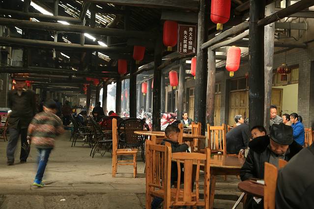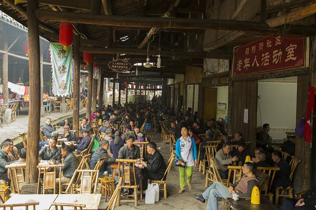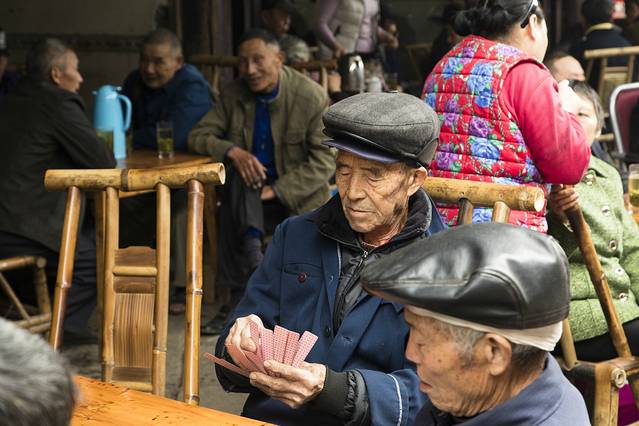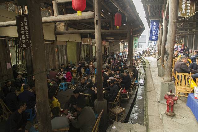 街道两边的屋檐下被称为“凉厅子”,在凉厅子我们见到了最壮观的打牌场景。一两百米的街道两边,屋里屋外全是打牌的人,至少有数百甚至上千桌,多数都打当地流行的一种叫乐山大二纸牌。还有少数喝茶聊天,赶集卖菜、卖花、卖小吃、卖鸽子的,算命的、发呆的、抽烟的、抱膀子看热闹的,游玩拍照的、看稀罕的。人生百态,此处尽现。