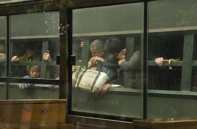 只拉了5节车箱,车箱也很小,而且没有车窗玻璃,乘客抱着车窗的栏杆,看起来车箱内很拥挤。