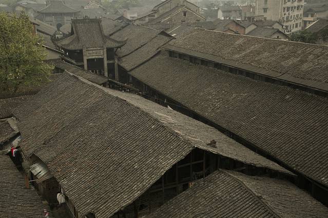 罗城古镇该称为罗城老街更恰当,因为古镇主要景点就是一条街——船型街。船形结构,东西长,南北短,从高处俯视,又象是一只搁置在山顶上的大船,街面是船底,两边的房屋建筑是船舷,中部的戏楼是船舱,东端的灵官庙好似大船的尾篷。