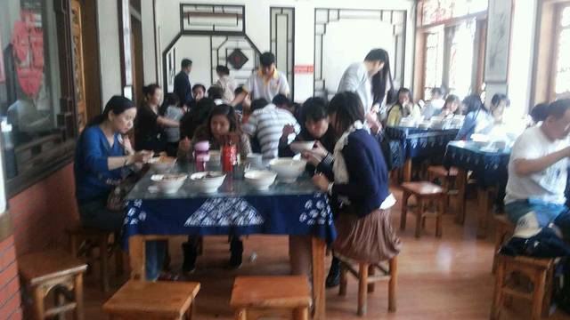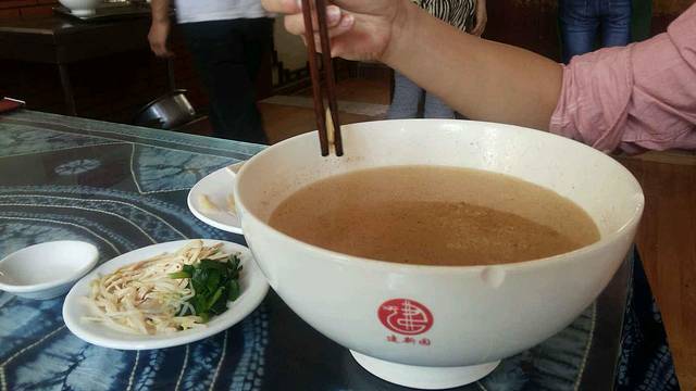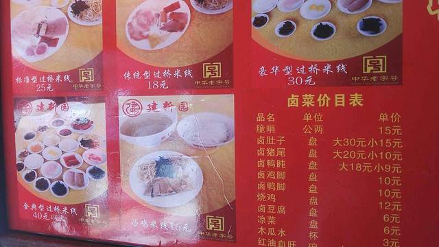出祥云美食城,往宝善街方向走,走几分钟,就到了建新园宝善街店。之所以选择在这家吃过桥米线,是因为建新园是传统老店,而且他家这个店据说比较好!所以即便是看到桥香园,也没去吃……点了两个,传统过桥米线(18元)和凉拌什锦米线(7元)。过桥米线在二楼,其他在一楼,生意比较好,服务态度和环境一般。小份的凉拌米线分量已经够了,味道是我喜欢的酸甜味,不出众。过桥米线是端一碗热汤,然后自己把料放进汤里,烫熟。料有生鹌鹑蛋,火腿,肉片,豆皮丝,和一碗米线。料放进去一会儿就熟了,因为汤油多,能保温,所以食材都能烫熟。汤蛮鲜的,但是个人不是很喜欢,胡椒味重,米线个人感觉一般,没有吃了再想去的冲动。最后也还是尝了一点,这也算是吃了回正宗的过桥米线吧!走的时候人家都问,你不吃了么?其他顾客说可以打包的!我当时在他们眼里感觉好浪费!因为一个人点了两份(男友没吃),量大还没怎么吃!最后,个人觉得过桥米线适合游客,或者喜欢吃汤米线的人……可能不大适合重庆的口味!