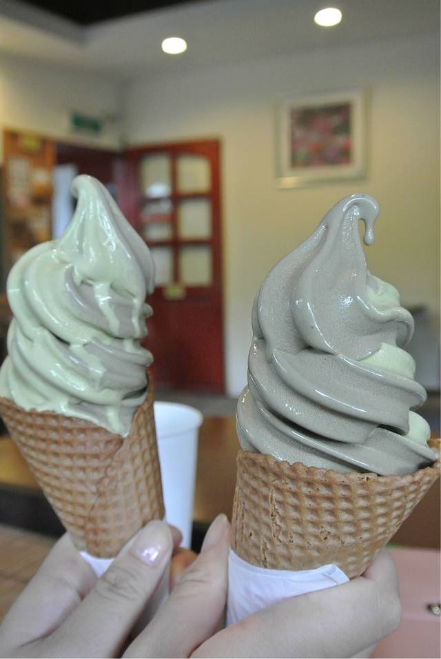 霜淇淋。就是冰淇淋蛋筒,茶味的超好吃,蛋筒很脆很脆,茶味很浓,不是那种很假的抹茶而是那种真正的茶味。有两种味道铁观音和包种茶,你可以要双拼的就都能吃了。我们一人要了一个,小蕊子可是在猫空还吃过一个蛋筒的人都忍不住吃了一个。