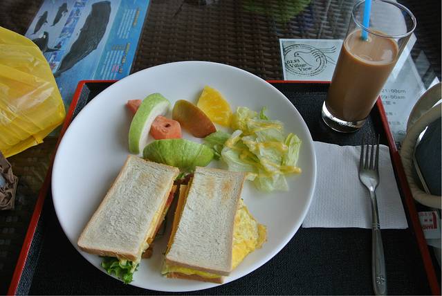 老板娘的早饭是水果加吐司加奶茶或者红茶。我们上楼之后就看到宝贝一个人坐在窗口喝冰奶茶。最后一天了怎么可以放过这个调戏宝贝的机会呢,走过去给宝贝打招呼。宝贝抬头看我们说你们坐旁边,好吧,我们和宝贝相处总是被动的一方。等早饭的时候宝贝问小蕊子要手机,说要上网,哎手机真是毒害下一代啊。