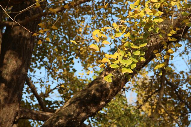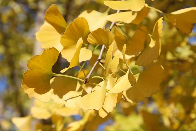 树干笔直的银杏,那泛着金黄的树叶,像扇子、像鱼尾、像蝴蝶,燃烧着一簇簇金色的火焰,在蓝天与青山间飞舞、跳跃,让这个吹着冷风的冬天,抹上一笔火般炽热的色调。