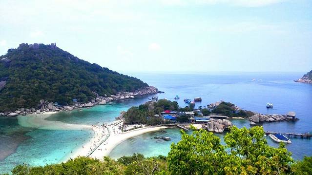 南园岛(Koh Nang Yuan)南园岛位于泰国海湾,临近苏梅岛,在涛岛西北面。南园岛岛由三个小岛组成,最有特色的在于它与众不同的“人”字型沙滩,将三个小岛连接起来。与龟岛西面的sairee沙滩的热闹很不同,这里很安静,世外桃源般的安静,非常适合度蜜月的新人,黄昏时,一边欣赏广阔的海的尽头的绚烂的落日,一边享受你们的浪漫晚餐,呢喃低语。然后,赤脚在细软狭长的沙滩上散步,左右两边都是海,低沉的滔声,漫天的繁星。(一会儿我分享一些南园岛照片)