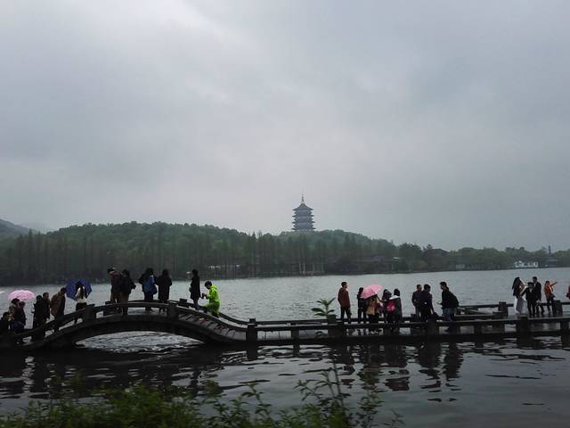 三三两两的游人在桥上驻足,山色空蒙雨亦奇。“欲把西湖比西子,淡妆浓抹总相宜。”