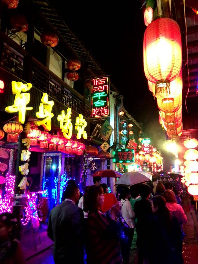 沿河民居点燃了河道边上的红灯笼,现代化的霓虹灯、五颜六色的广告牌,暮色里的闪闪暗红