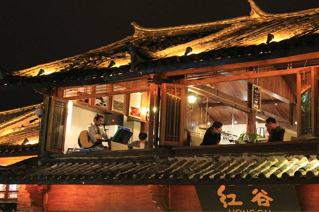 回来整理照片,却发现我进入丽江拍摄的第一张照片,不是比较现代化的丽江火车站,也不是找寻四方街时候沿途绚丽的夜景,而是以下的这张。回想起来,原来是当时驻唱歌手浑厚的歌声(歌名已经忘却)让我驻足,这样的人,不管在哪里都有很多,他们心中有着自己的理想,正如我们每人心中一梦,不管现实是自己喜欢的或者是不喜欢的,至少我们还在为了理想坚持并为之努力。所以记录下这一刻,祭奠我曾经逝去却又被找回来的梦......当晚的丽江,我拍摄的照片并不多,个人喜好问题,我始终情愿接受原生态的事物。就如同去年十一的某个夜晚刚到凤凰,穿过虹桥下面的巷子,两旁躁动的音乐,红男绿女在舞池里扭动着身躯,宣泄出来的荷尔蒙.....都让我焦虑。所以在丽江,秉着既来之则安之的态度,走一个过场就好。