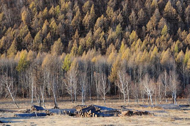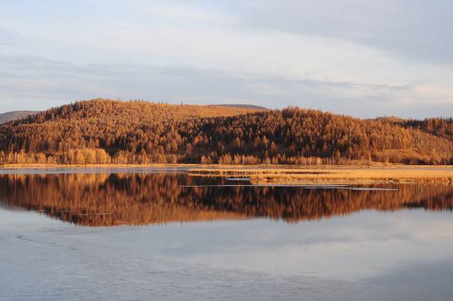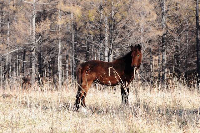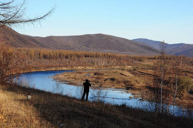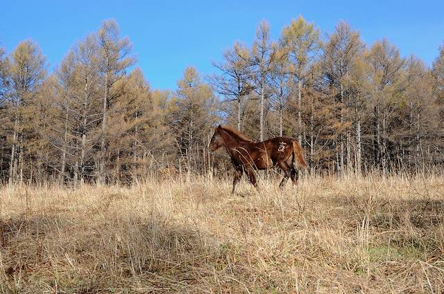 因为底盘问题,原定的公主湖薄雾没拍成。在小道上转了转,拍了拍照。离开小镇几百米,远远眺望月亮河边的小镇,这也是此行最有亮点的地方。好像一片世外桃源,景色不亚于阿尔山,而且人更少,物价更便宜。突然耳畔传来铃声,我无知的说骆驼队伍来了。走着走着,才看见林间草地上的马儿。头马带着铃铛,领着一群骏马,享受着秋天的阳光和最后一地新鲜的马草。中午离开月亮河小镇,往蘑菇气方向开始返程。路边的风景,难得见这么平静的河水。