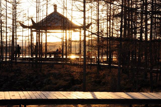第三天:起个大早,天气实在太冷,车身玻璃结了厚厚一层霜,热车半小时。在旁边的铁皮屋匆匆吃了早餐,先去旁边的阿尔山火车站“到此一游”。阿尔山火车站建于1937年,是一幢东洋风格的低檐尖顶二层日式建筑,如今整个火车站保存完好仍在使用,是内蒙古的重点文物。很文艺的火车站,好好拍点人像应该不错。按照路标,往伊尔施方向走。想早点到景区的人可以住伊尔施,价位也更便宜。出阿尔山市不久有一泉水处,很多人在接泉水,不爱凑热闹。直接前行。