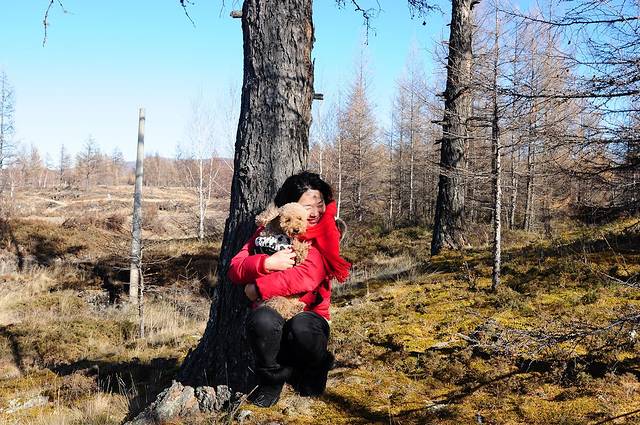 松鼠湖悠闲的晒会太阳吧,还是抱狗显瘦照