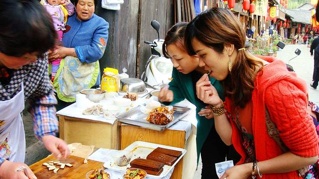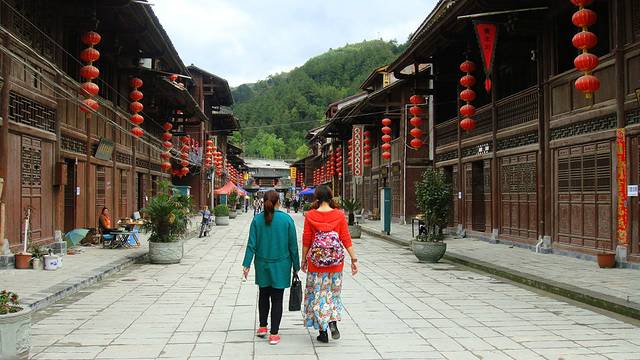 下车,走进一还在修葺的街道,人造古镇,泥砖墙外贴木头,这或许是大多人造古镇的独有的 方式,众人愕然,这是什么景区,哪里值得观看,稀稀拉拉的人 走来走去,当地居民小店卖着油炸山野菜,什么 土豆,香菜 什么的,花生稀饭,酸菜稀饭,说道酸菜稀饭,也不知道为什么川北的居民喜欢这样吃,第一次吃这样的粥是在广元,闻着和一般的粥都一样 ,喝下去才愕然,一股就像食物放久馊味,或许他们习惯了这样的美食,到了青木川的时候是13点30的样子,我们找了很多地方就发现这些食物,吃了些 同行的朋友吃完以后说,“吃了这些好想吃肉”