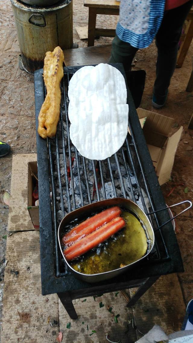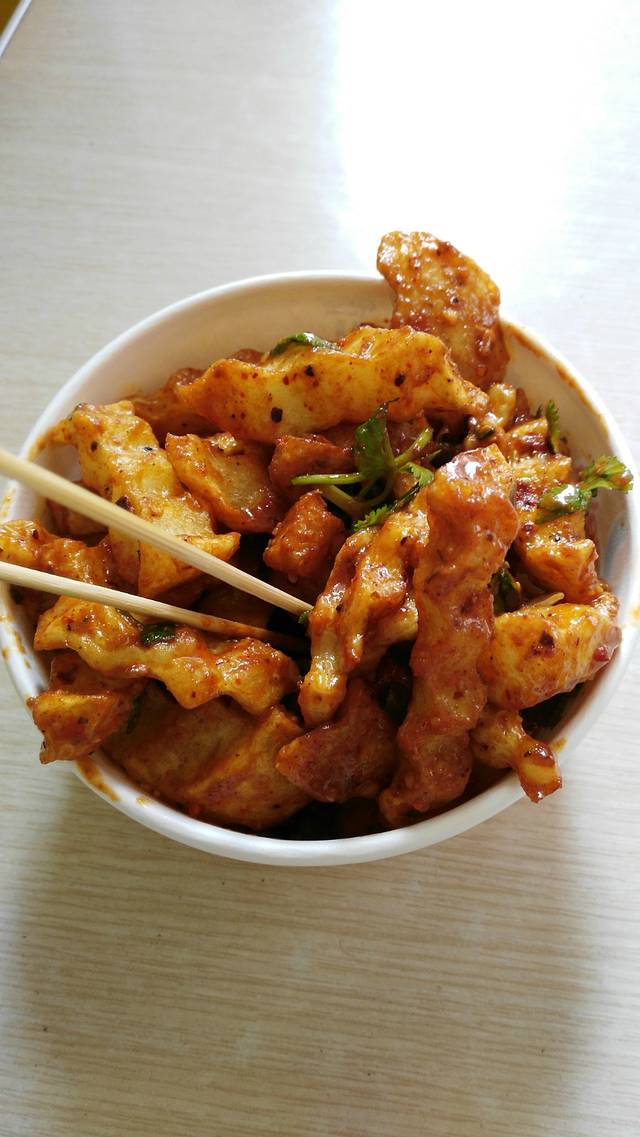 炸洋芋。。。。俗称:炸土豆!一般里面都会有白色小棍一样的东西,叫鱼腥草。。。。额。。。。反正我是接受不了那个味道!都会告诉他不要放。。。。因为真的很腥啊!!