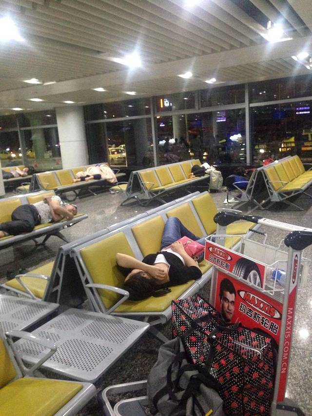 晚上12:00到达重庆。。。。。。。空气湿热湿热的。。。。。。。。黏黏的。。。。和4月初的沈阳比简直就是盛夏!当晚温度31°。。。。。/(ㄒoㄒ)/~~ 由于是2个女生真心不敢晚上去住重庆的小旅店!出了机场,到处都是住宿包接送机的小旅店,一般都是160元左右,由于是山城,不是所有房间都会有窗户!大家要是去建议在网上提前订好!否则就和我一样选择露宿大巴站吧!机场晚上是不让在候机厅停留的!但是机场旁边就是大巴站,里面环境不比机场差哦!不愿意住宿就选择大巴站吧!偷拍了一个等大巴的妹纸,已经睡的呼呼的了! 我俩还在聊天,饿了,我就顺便把飞机上发的蛋糕吃掉了!一会也就抱着背包睡着了,大家一定要少带现金,提款机多得是!多带点零钱就好!
