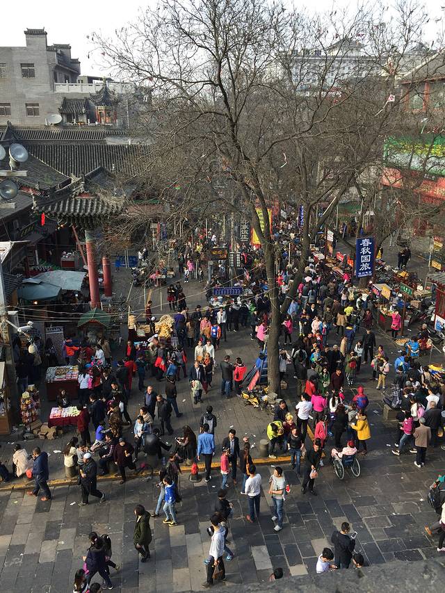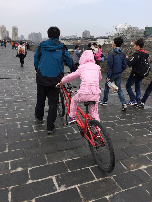 自由行就是任性!睡到自然醒,九点多才出门!我们的酒店离城墙南门永宁门很近,步行十几分钟!我们溜溜达达来到城墙南门!十点南门有个小型表演,要站到南门外观看。可惜我们进去城墙景区了,只能看背影了。不到十分钟的表演也就看个热闹吧!西安的标志性建筑物,它几百年的历史还是让人极为惊叹的!说实在的吧,城墙长共计13.73km,步行的计算时间吧!城墙上面租自行车,单车45元、双人90元、限时两个小时。观光电瓶车80元/人。我们租了个双人的,孩子坐在横梁上,骑的那叫一个痛苦。最受不了的是双人车减震不如单人车,屁股那个疼啊!骑了一个半小时,途径安定门(西门)、到达安远门(北门)我们决定还车,从北门进入城内。要是不带小朋友的可以租两辆单车,重新回到永宁门,因为从永宁门进入,到钟鼓楼是最近的。不要说脚力好之类的,因为城内逛起来也很累人的。