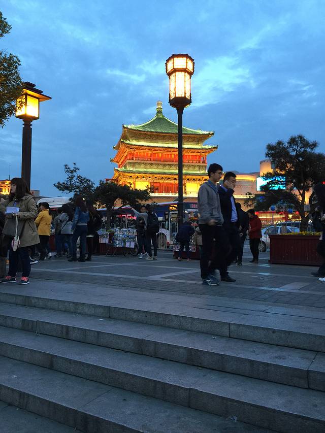 12点多从城墙下来,没吃早餐的我们,饿的饥肠辘辘的。在去钟楼的路上,看到了魏家凉皮,进去点了几样,味道果然不错,方便快捷,价格合理。后来发现西安到处都是魏家凉皮的连锁店。我们步行来到钟楼,人超级多,钟楼定时有讲解和表演。讲解没有听到,只看了编钟表演。钟楼只有一口钟,实在是没什么可看的。表演也很一般,不是很喜欢。不过夜景相当的美!