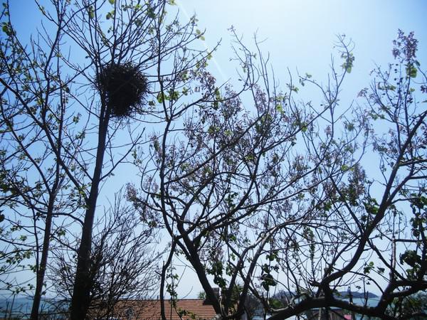 房前的树风姿绰约的,上面还有喜鹊窝。