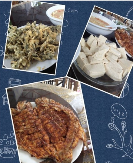 我们在一进村门口那家绿色竹门那家吃的,烤鱼、农家老豆腐、疙瘩汤、炸花椒芽。共计140元,味道不错,尤其是豆腐。