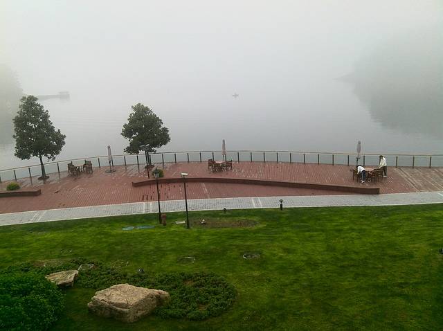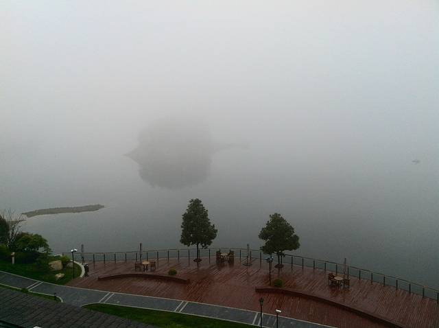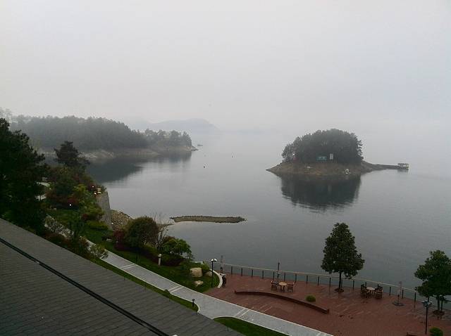 清晨房间望去的酒店前的湖面,雾气很大。