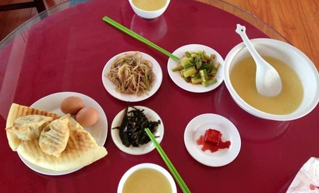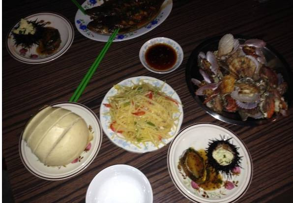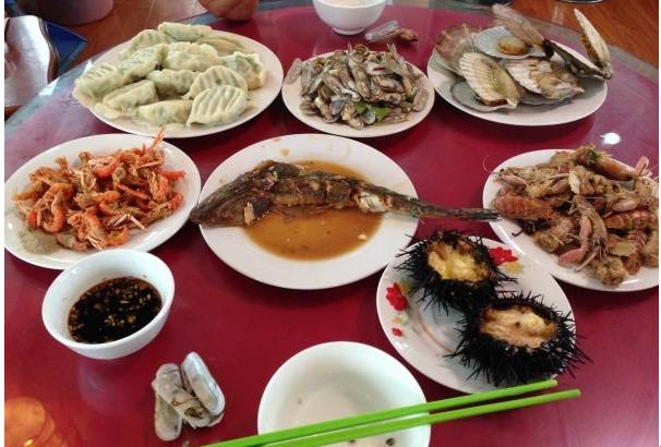 回到渔家乐,已经七点半,老板娘正好在给我们做晚餐。晚餐是每人一只蒸海胆,每人一只鲍鱼,一盘土豆丝,一盆扇贝,两条鲅鱼,一盆海菜蛋花汤,还有一个超级大的馒头。