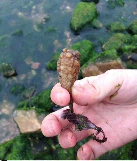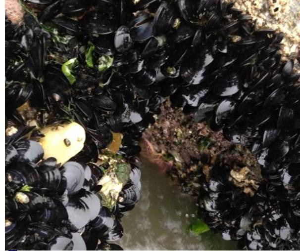 石头上长满了海虹,水里有只吸附在岩石壁上若隐若现的海星