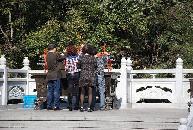 好多虔诚的叔叔阿姨们都在寺庙里上香,他们闭着眼睛好像在将自己内心隐藏着的所有喜怒哀乐都跟神佛诉说。有些人们的眼色中流露着喜悦,好像在还愿,大佛赐福了他们的心愿。我们大家族里的舅舅舅妈也去买上蜡烛和香火,在这蓝天白云下深深的鞠躬,虔诚的鞠躬。