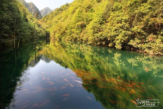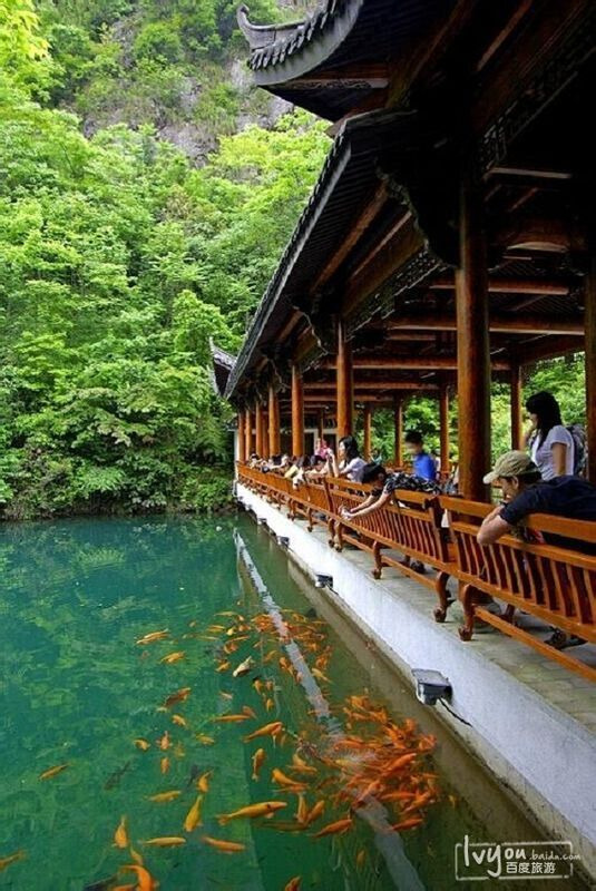 前面有个长廊的亭子,小朋友们看见亭子上有一群人围着也冲了上去,我紧跟在后头,原来大家围着亭子在给水里的鱼儿拍照呢。这里的水可真活了,绿的跟九寨沟的水一样一样的,整个画面犹如一幅仙画。水里的鲤鱼个头特别的大,一看就是生活的特别的滋润,好山好水居住在这里一定特别的享受。