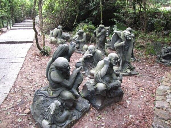 一路往上走,所见的都是青山绿水,所闻的是森林中独有的清新空气,不止是觉得自己的肺被净化了,好像整个人都变得轻松了呢!当然,千佛山最重要的是他浑然天成,不假雕饰的千尊佛像啦。眼前的这是我们遇到的十八罗汉塑像。罗汉们或站立着思考,或静坐着枕着胳膊,世间万物,痴笑怒骂,我想这应该是他们思考的人生吧。