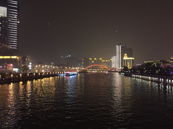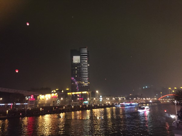 逛完学府后,天也完全黑下来了,可以去欣赏海河夜景了。因为海河太窄不建议乘船,建议沿河步行。因为我去的时候是清明特殊时期,如果不早早定好天津眼票的话去的时候就没有了,但平时是不会发生这种事情的。也因为是清明,许多人在海河边放天灯,在天津眼上你可以看到至少数以百计的天灯向你飞来。不得不说,海河夜景真心漂亮,加上天灯的点缀后更是给人一种震撼的感觉。