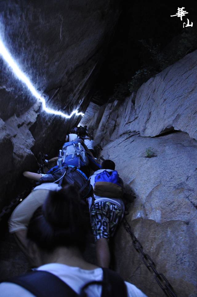前半夜爬山会觉得热,出大量的汗,但只要熬过凌晨1点以后,就是机械性的运动了。走一段歇一会,只要保持一直向前进,不用休息太长时间就好。一路上我们始终坚持“只走近路,不怕险路”的原则(其实因为夜行的原因,就是90°的爬坡也不会觉得害怕)。最终我们在4:10成功到达华山东峰。其实事实证明华山还是可以征服的,四个从不运动的女汉纸(两硕士+两博士)用了6个小时就可以从山脚到东峰。路上还遇到一个胖爸爸抱着6、7岁的孩子爬山的(这也是鼓励我不断向山顶攀登的动力)。