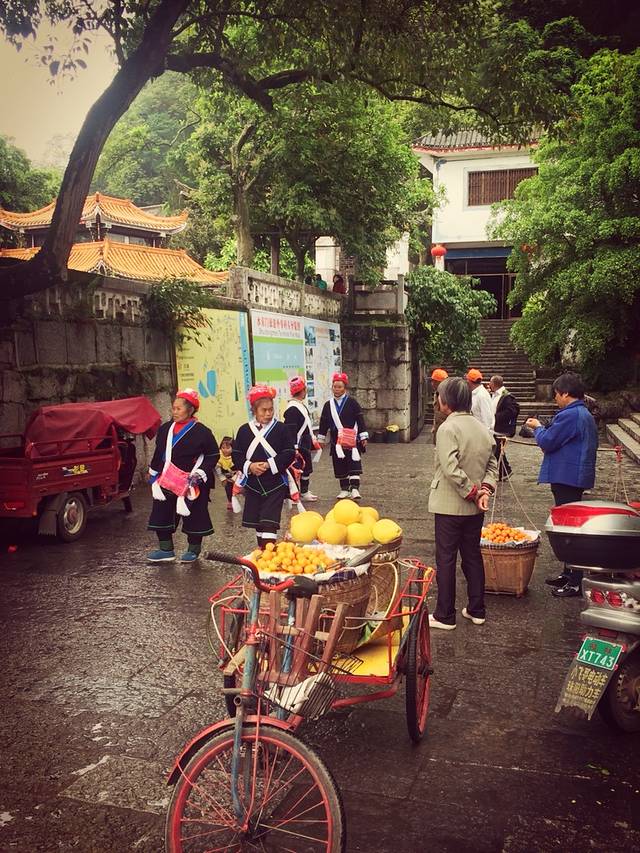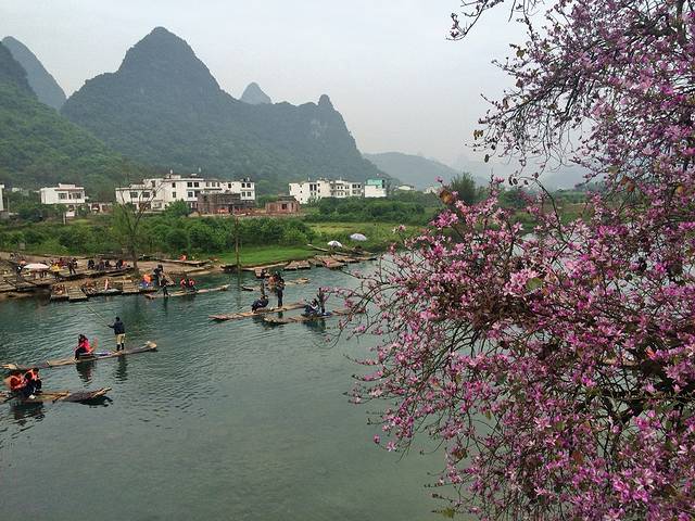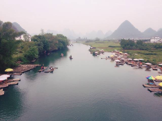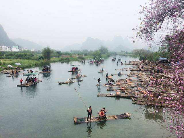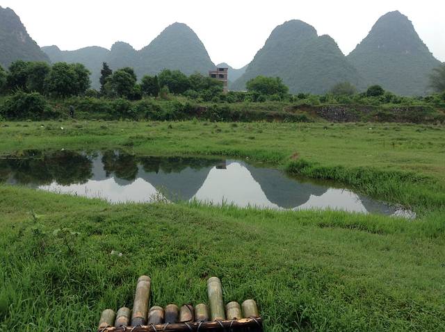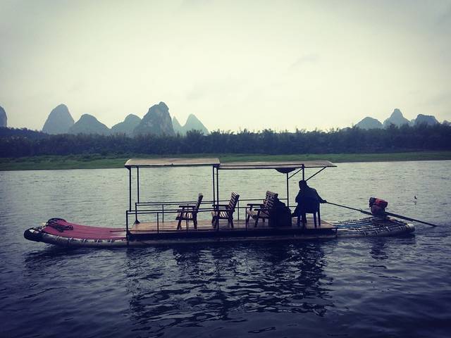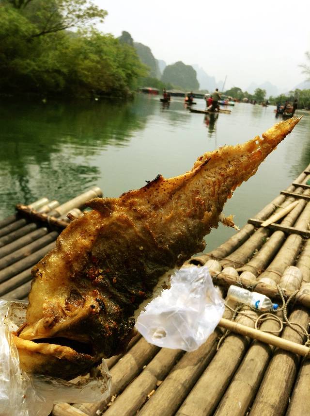 出发前就在淘宝上找到中国旅行社订好了遇龙河漂流和晚上印象刘三姐的票,昨天下午旅行社主动联系我,告诉我竹筏师傅的联系方式,今天一大早我们先在西街吃了两碗粉,干拌粉比较好吃,先吃粉再喝汤。然后联系了竹筏师傅,坐汽车到他指定的地方,开始了如画般美妙的漂流旅程。竹筏师傅很给力,觉得我们是从西安来的,不容易,所以硬是把一个小时的行程给我们划到了两个半小时,超值了!所以听他的推荐,在遇龙河中间吃了六十块半条的野生鱼,不过很好吃,还请他喝了啤酒。上岸后有农家乐的车来接,那周边没吃的,只能上他们的车。好在农家乐并不很贵,我们两个吃了八十多块。那家农家乐就可以租车,我们一路骑行十里画廊。什么蝴蝶泉,月亮山,大榕树,兴趣不浓的话可以不去看,没必要的。大约四点多我们骑车回到西街,屁股都疼死了!在于记糖水店休息了片刻后,旅行社打来电话约晚上演出取票时间地点,顺便就约了他们的接送车,两个人往返20,比打车划算。印象刘三姐还ok吧,没想象的那么好,但还是值得一看,比坐酒吧等艳遇有意义。