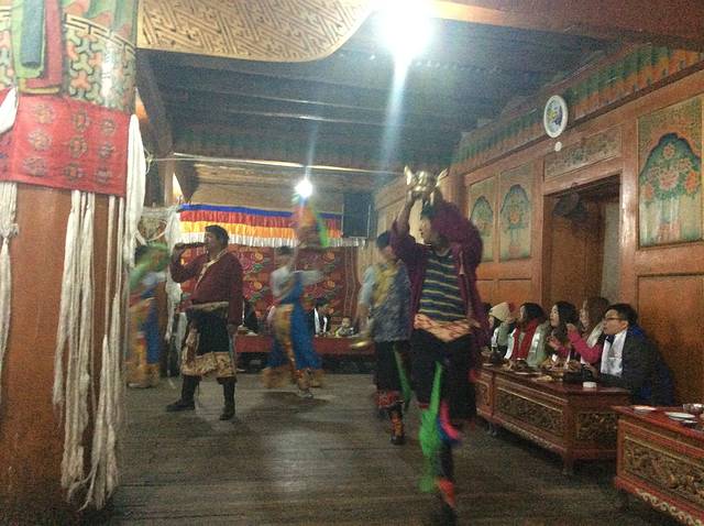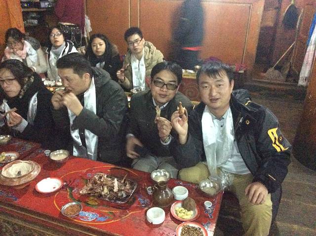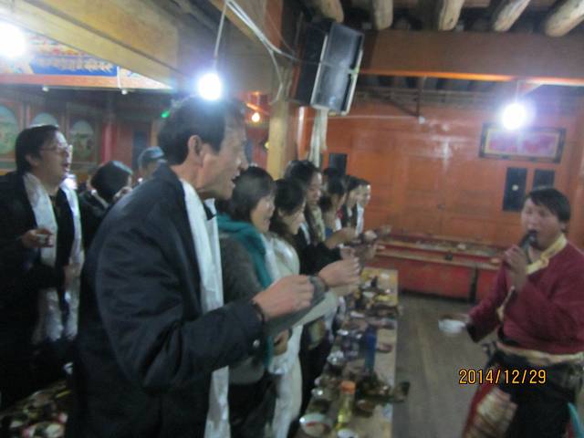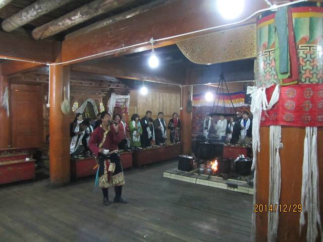 晚餐后会去一家藏民家里吃牦牛肉,收费150元,虽然说的是自费项目,但基本都交了。进门首先一条哈达挂上来,扎西德勒,然后有位卓玛会与你合影(之后才知道是卖影集),然后喝一杯青稞酒,进门,入座,晚会开始,教你做糌粑,然后上牦牛肉、烤鸡,大概2个小时,出门有篝火,可以唱歌跳舞,然后上车回宾馆。