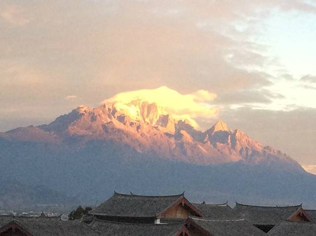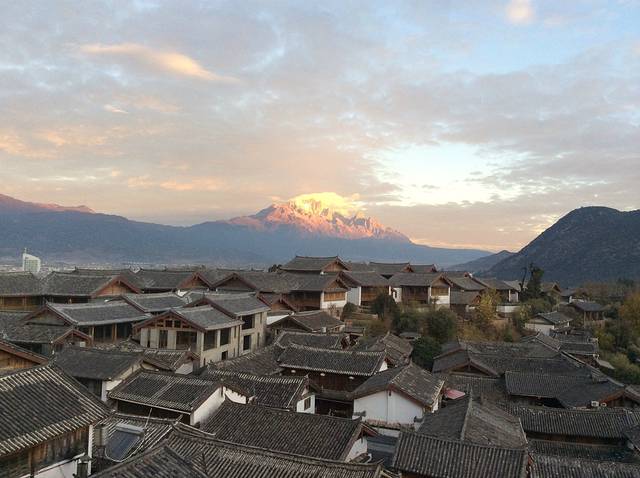 清晨的玉龙雪山和丽江古镇