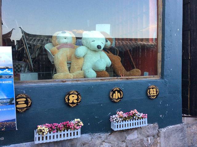 这是一个名叫三只小熊的酒吧,橱窗里的它们正在安静享受着这一幕夕阳呢