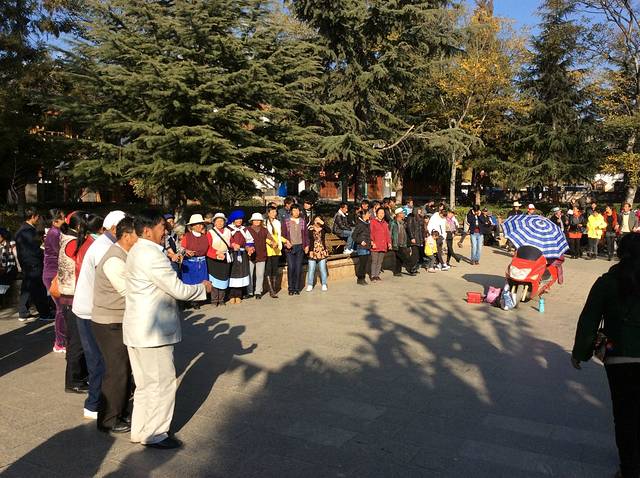 门口很多纳西族的老人围成圈在一起跳舞